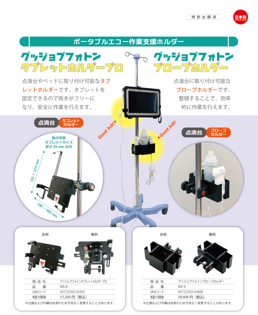 グッジョブフォトンプローブホルダー ポータブルエコー作業支援ホルダー グッジョブフォトンプローブホルダー 商品説明 点滴台に取り付け可能なプローブホルダーです。 整頓することで、効率的に作業を行えます。 スペック 商品名グッジョブフォトンプローブホルダー 品番NR-9 サイズ全長:160mm 重量685g 希望小売価格39,600円(税込) この商品について問い合わせる この商品をシェアする FEATURE商品特徴 グッジョブフォトンタブレットホルダープロ・プローブホルダー カタログダウンロード